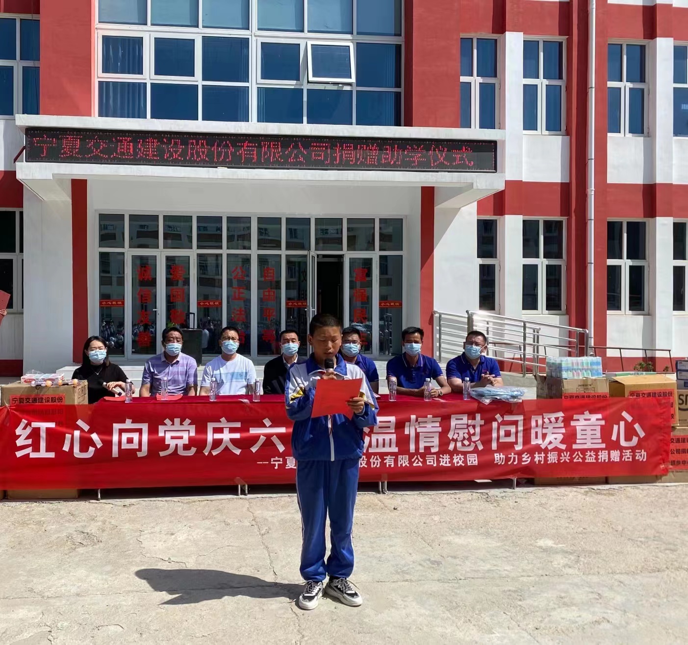 5月31日,宁夏交通建设股份有限公司在“六一儿童节”来临之际,走进彭阳县孟塬乡中心学校,开展“红心向党庆六一 温情慰问暖童心”公益捐赠活动,为孩子们送上节日礼物,让孩子们度过一个愉快而有意义的节日,感受来自宁夏交建的殷切关怀,同时进一步把党史学习教育持续引向深入,为群众办实事,助力乡村振兴。彭阳县公路管理段副段长张明,宁夏交建养护事业部总经理李忠,彭阳县农村公路管理养护服务项目,彭阳县新集堡子至阳山公路项目全体人员参加本次活动。